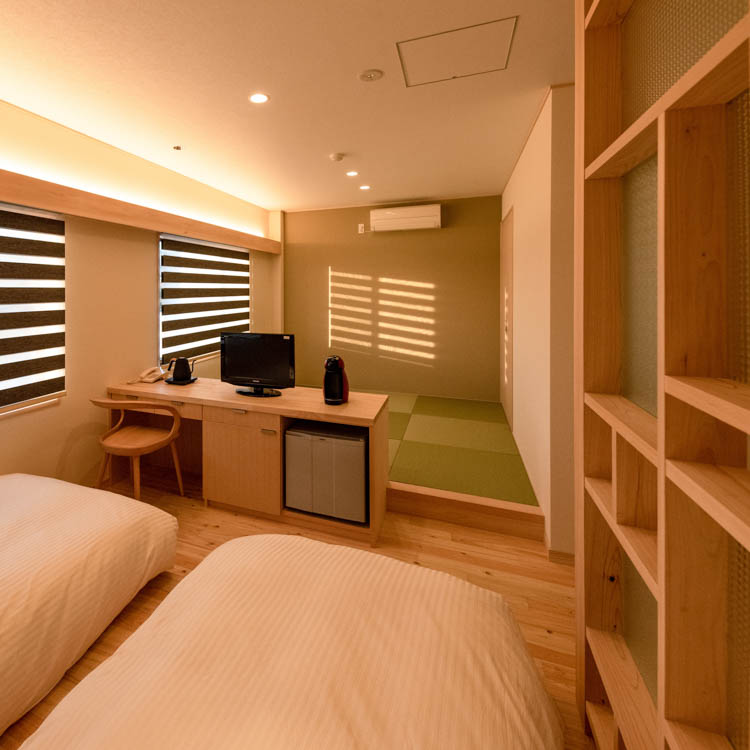 ★2021年12月からの新客室! 杉の木をふんだんに使用した古民家調で和モダンな和洋室 昔ながらの作り建具・無双窓がノスタルジックを感じさせる ベッドはシモンズ製のシングルベット2台ご用意しております ◆畳の間に和布団...